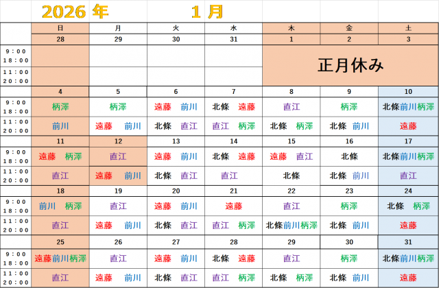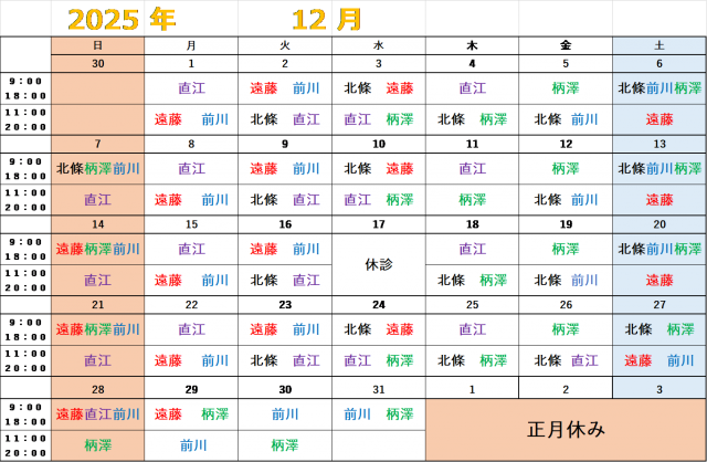 ※上段が9時~18時、下段が11時~20時の形で記載しています。